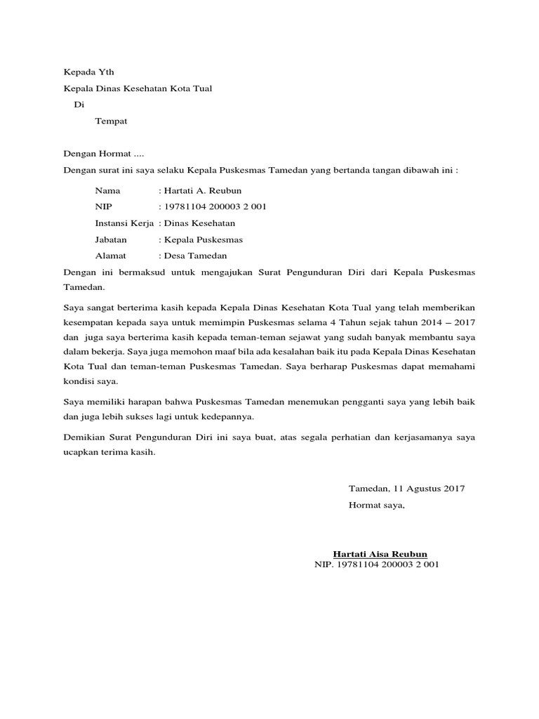 Surat dinas memilki ciri yang membedakan dengan surat lainnya yaitu surat ini berisi kop surat dari perusahaan baik kumaidi muhammad aqil. Aktif berorganisasi di kampus atau masyarakat adalah hal yang lumrah dilakukan bagi banyak orang, terutama bagi apalagi jika anda adalah pegawai honorer atau pegawai tetap yang telah terdaftar di pemerintah, maka surat pengunduran diri wajib. Contoh surat pengunduran diri dari partai Surat pengunduran ini bukan hanya digunakan oeh perusahaan swasta saja, namun juga digunakan oleh instansi pemerintahan. Contoh surat pengunduran diri doc 3.4.